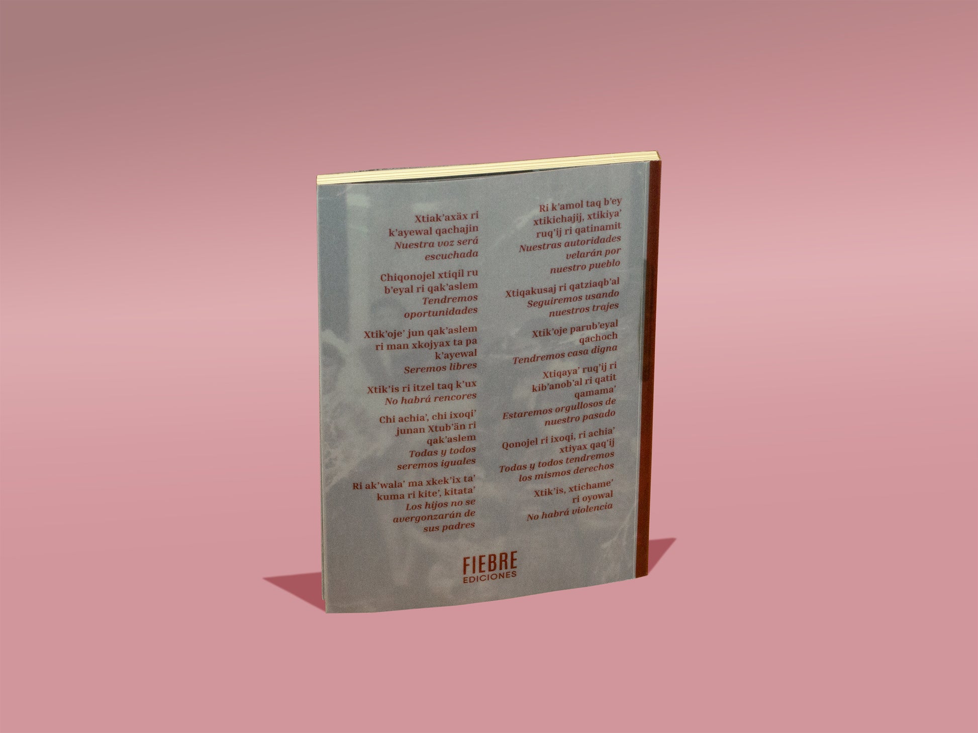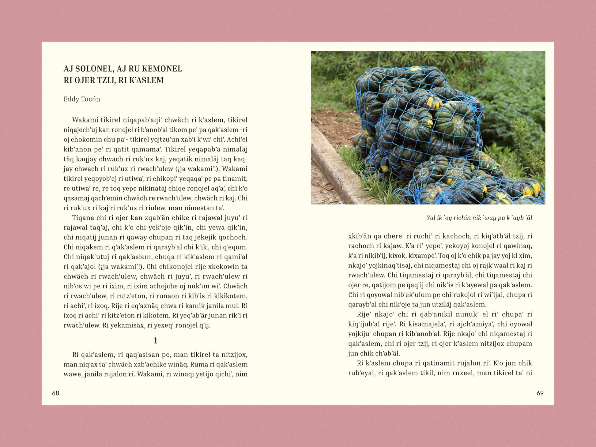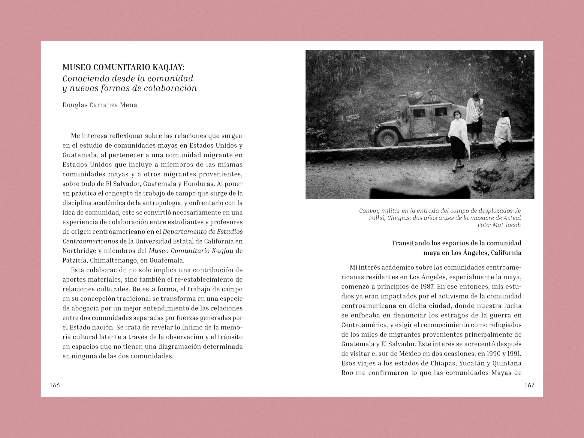 El libro incluye ensayos sobre identidad, arqueología comunitaria, la construcción de la memoria, y la experiencia de las comunidades mayas en Los Ángeles, escritos por Kaqjay Moloj, Eddy Tocón, la Comunidad Kaqchikel de Investigación, Beatriz Cortez y Douglas Carranza Mena, además de fotografías de archivo e imágenes de las intervenciones realizadas por el colectivo a lo largo de los años.
